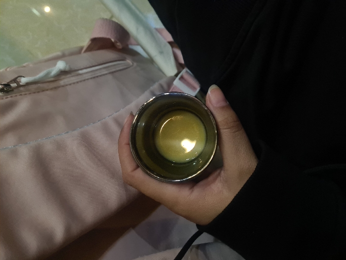 A close-up, high-angle shot in At-Tall, Syria, focuses on a person's right hand holding a small, cylindrical, metallic cup. The cup, approximately 7 cm tall, contains a light yellow liquid with a distinct circular reflection from an overhead light source. The individual's hand, of medium skin tone with visible, unpolished fingernails, wears a long-sleeved black garment, likely a sweatshirt or jacket, which occupies the lower left and right portions of the frame. In the upper left and right background, a light pink or beige backpack with a visible metallic zipper and a white rope-like zipper pull is partially visible. Light blue stitching is discernible on the backpack's fabric. A reflective surface, possibly a tiled floor, is present in the far right background, exhibiting another bright circular light reflection. The scene is indoors.