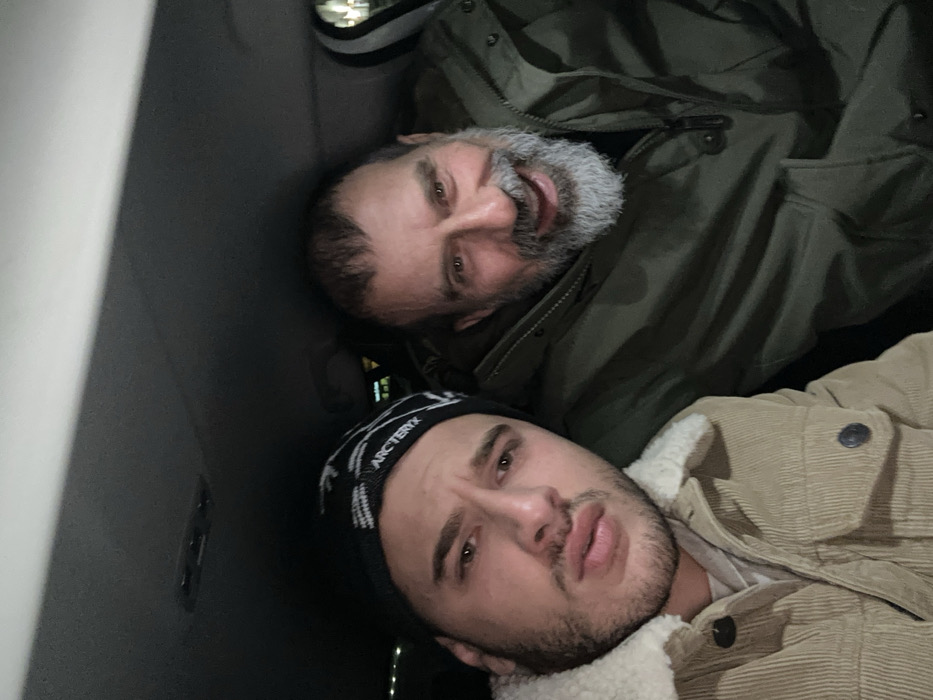 Two men pose closely for a selfie, seemingly inside a vehicle. The older man, above, sports a gray beard and wears a dark green jacket. The younger man, wearing a black beanie and beige corduroy jacket with a white shearling collar, looks directly at the camera with a slightly pouty expression. The photo is angled, with the left side revealing part of the vehicle's interior. The lighting is dim, suggesting an evening setting.
