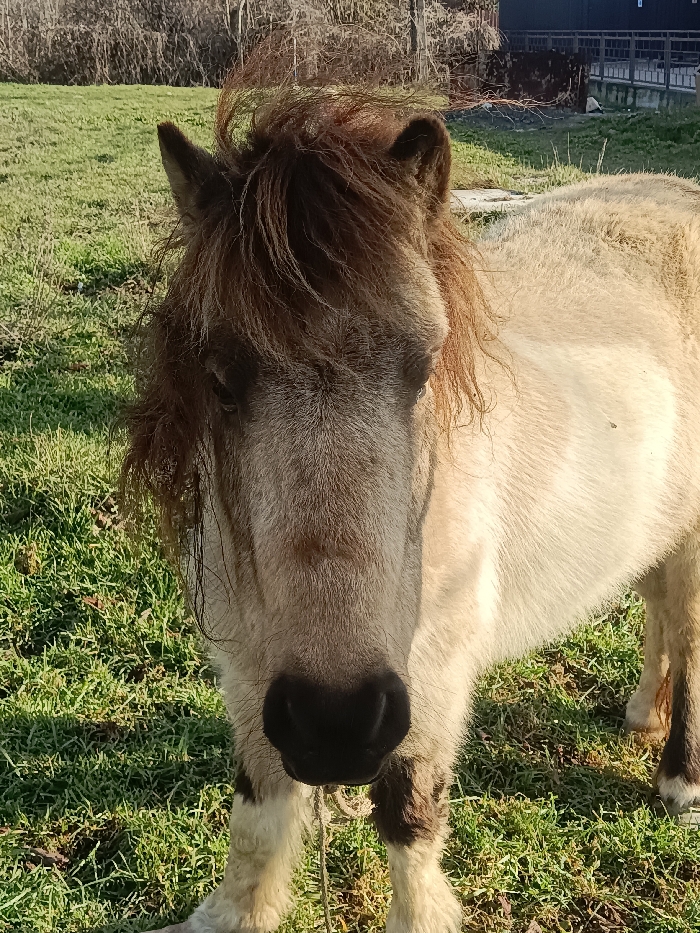 A light-colored horse stands centered in a grassy field in Голубинское сельское поселение, Ukraine, facing directly towards the observer. The horse exhibits a cream to light tan coat with darker brown markings on its lower legs and a shaggy, reddish-brown mane and forelock, the latter partially obscuring its eyes. A thin, light-colored rope is present around its muzzle. The immediate foreground is dominated by green grass under natural sunlight, casting visible shadows. In the background, bare deciduous trees and brush are visible to the left, while a dark building structure and a metal fence are present to the right.