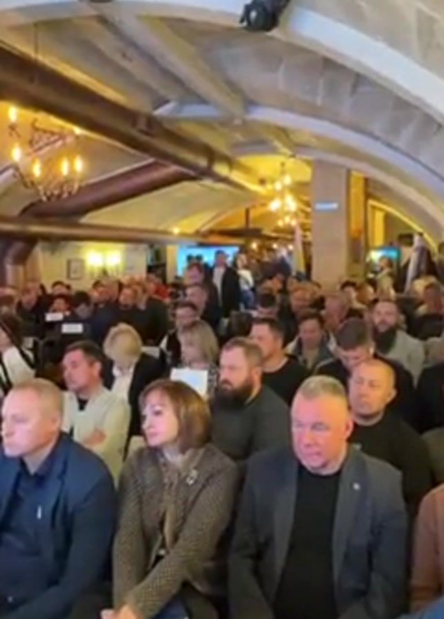packed room with people seated in rows, listening to someone speaking at the front. Most of the audience members are men, and they are dressed in business attire. The room has an arched ceiling with exposed beams and several ornate chandeliers providing light. There is a screen at the front of the room, and a Ukrainian flag is visible in the background. The camera pans across the room, showing the faces of the attendees.