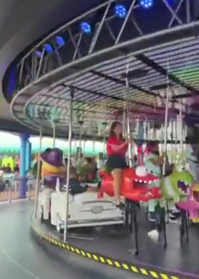 People are riding a colorful carousel. The carousel has various cartoonish animal-like figures, including a red monster and a green frog. A white car is also part of the carousel. Lights of various colors illuminate the carousel from above. There are other people visible in the background. The carousel is rotating.