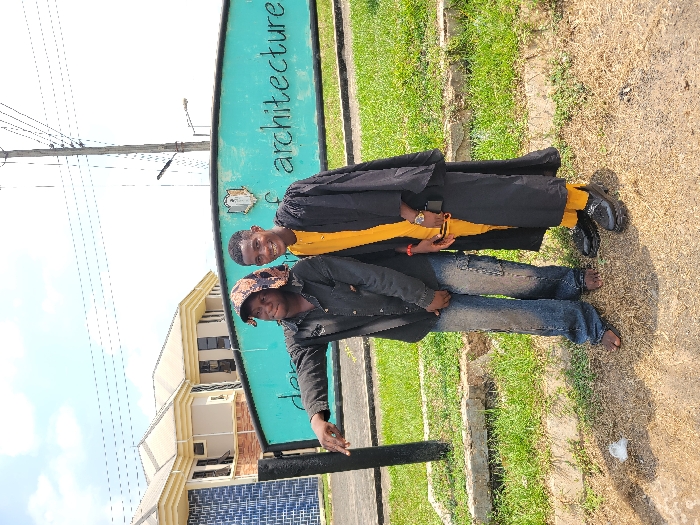 Two males are depicted standing outdoors in Awka, Nigeria, in front of a large, curved teal sign that partially reads "department of architecture," indicating an educational institution, likely Nnamdi Azikiwe University. The sign features a crest on its upper left side. Behind the sign and to the left, a multi-story building with a light-colored facade, dark window frames, a blue tiled section on its lower left, and a light-colored hip roof is visible. A utility pole with multiple overhead wires is present in the background to the right. The male on the left wears a dark long-sleeved shirt, faded blue jeans, and a patterned head covering. He is barefoot, points to the left with his left arm, and displays a slight smile while looking towards the camera. The male on the right wears a bright yellow tunic under a black academic gown and black loafer-style shoes. He has a watch on his left wrist and holds a dark object, possibly a mobile phone, in his left hand. He is smiling broadly and looking directly at the camera. The ground in the immediate foreground is dry earth with sparse, dry grass, while greener grass and a concrete curb are visible behind the subjects. The sky is partly cloudy.