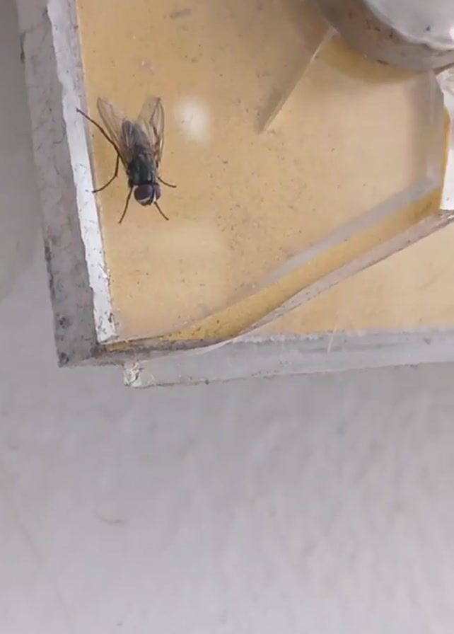 A high-angle close-up shot depicts a fly resting on a yellow and white surface. The fly, with a dark body and translucent wings, is positioned near the corner of the surface. Part of a metallic, round object is visible in the upper right corner of the frame. The background is white and appears to be a wall.