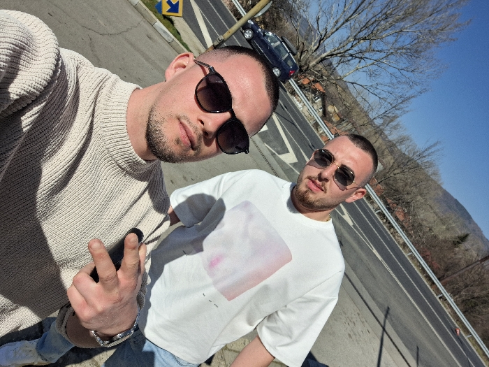 A daylight selfie depicts two adult males posing outdoors in the city of Dragichevo, Bulgaria