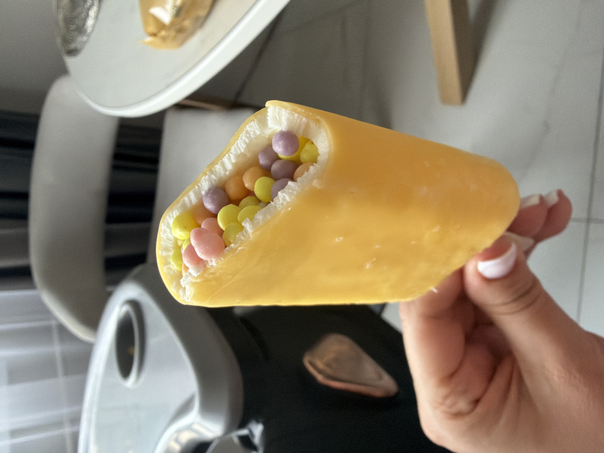 The scene, located in the city of Chaikovsky, Russia, features a human hand holding a partially consumed yellow popsicle bar in the foreground. The popsicle's exterior is yellow, and a distinct bite mark on its upper portion reveals a white interior packed with numerous small, spherical candies in shades of yellow, pink, purple, and orange. The hand exhibits manicured fingernails with white tips. The background is an out-of-focus indoor domestic setting. Visible elements include a grey and black object resembling a high chair tray with a cup holder positioned to the left, and a white round table on the right, upon which a blurred, possibly gold-wrapped item rests. Further into the background, indistinct forms of furniture and a window with sheer curtains are visible.