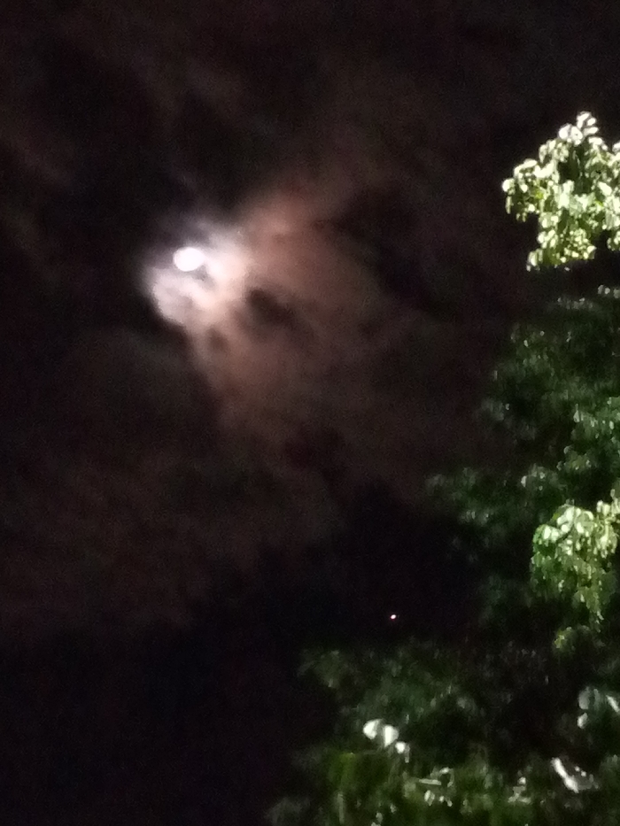 A nighttime scene featuring the moon partially obscured by clouds. The moon emits a soft glow through the surrounding cloud cover. To the right, a dark green tree fills part of the frame. A small red dot appears amidst the branches, possibly a light source or distant object. The sky in the background is a dark, almost black color.