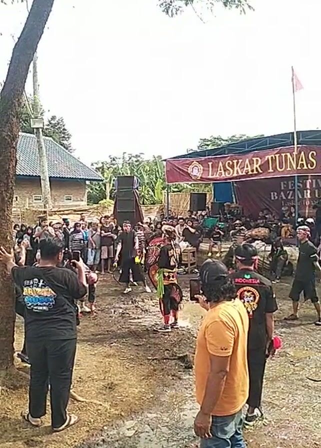 The video captures a lively outdoor event, possibly a cultural festival or performance, set against a backdrop of a banner that reads "LASKAR TUNAS BANGSA" and "FESTIVAL BAZAR." Numerous people gather around, with some dressed in traditional attire. The event takes place on a somewhat uneven ground surface, which appears to be a mix of dirt and concrete. A small building with a tiled roof is visible in the background, along with trees. People are seen interacting with each other and watching the performance. Notably, some individuals are recording the event with their phones, capturing the action. In summary, the video portrays a vibrant community event with cultural performances and a lively atmosphere, all taking place in an outdoor setting.