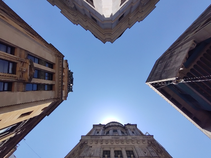 Four buildings enclose a bright blue sky. The structures are of varying architectural styles, with intricate detailing, ornate carvings, and visible windows. The sun shines near the bottom building, causing a bright glare. The buildings angle inwards towards the center, creating a sense of height and urban density. The viewpoint is from below, looking upwards. The colors are muted, with a range of beige, gray, and brown tones.