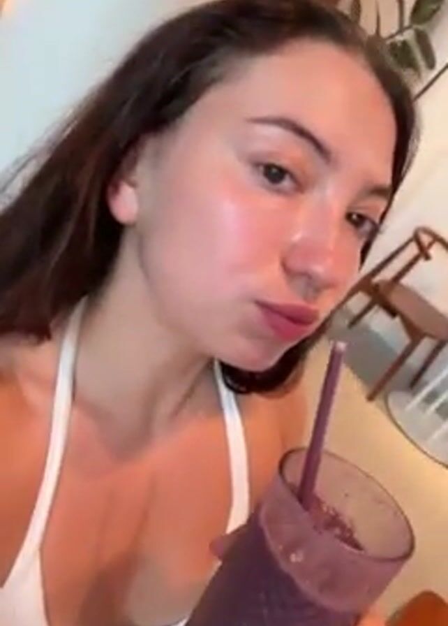 A young woman with light skin and dark hair sips a purple smoothie through a matching straw. She wears a white halter top and appears to be indoors in a brightly lit space, possibly a cafe or restaurant. Background details include wooden furniture, potted plants, and other people. The woman appears to be filming herself, holding the smoothie in one hand as she drinks.