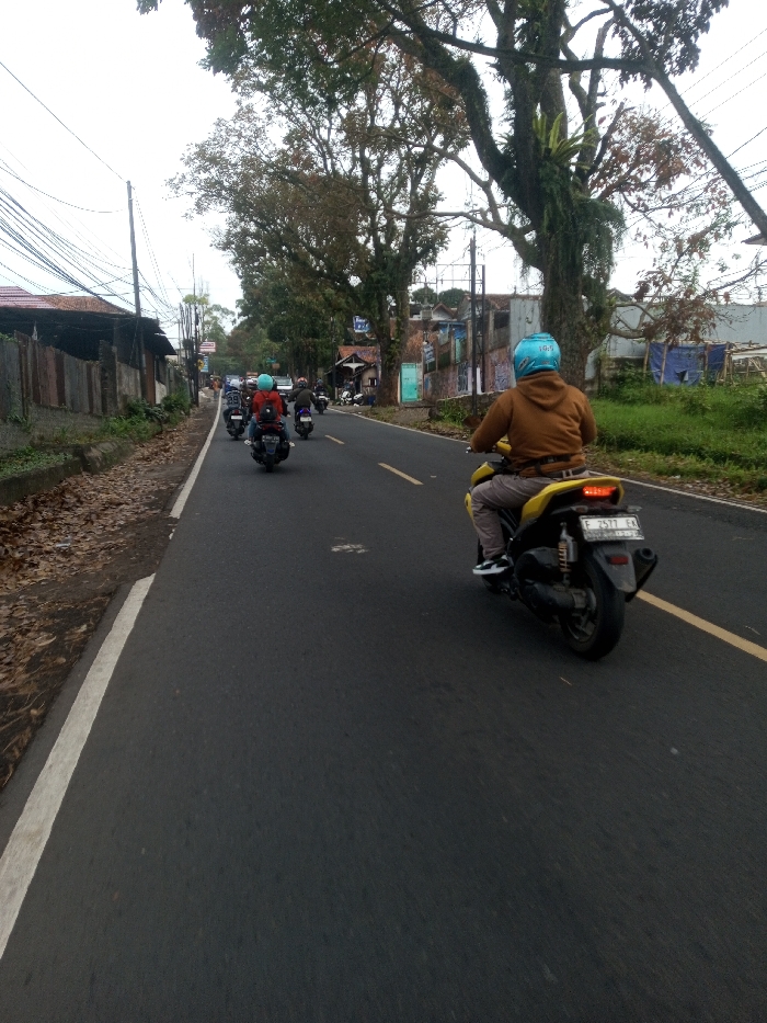 The image captures a street scene in the city of Sat Thay (East), Myanmar, under an overcast sky. In the foreground, a person wearing a brown jacket, light-colored trousers, and a light blue full-face helmet is operating a yellow scooter, which displays an illuminated red taillight and a rear license plate bearing the characters 'F 2577 EK'. The scooter is positioned on the right side of a dark asphalt road, marked with a solid white line along its left edge and a faded yellow line segment further right. Ahead, multiple other individuals on dark scooters are visible, traveling in the same direction. These riders are also wearing helmets and dark-colored clothing, with one rider distinctly wearing a red jacket and a light blue helmet. The left side of the roadway features a dirt shoulder covered with dry brown leaves, bordering a series of buildings constructed with corrugated metal siding and painted walls. Utility poles supporting numerous overhead power lines run parallel to the road on this side. On the right side, a grassy verge leads to various structures, including one partially obscured by a blue tarp. Both sides of the road are lined with mature trees featuring dense foliage, some exhibiting significant epiphytic growth. The road gently curves to the left in the midground, with additional buildings and vehicles discernible further in the distance.