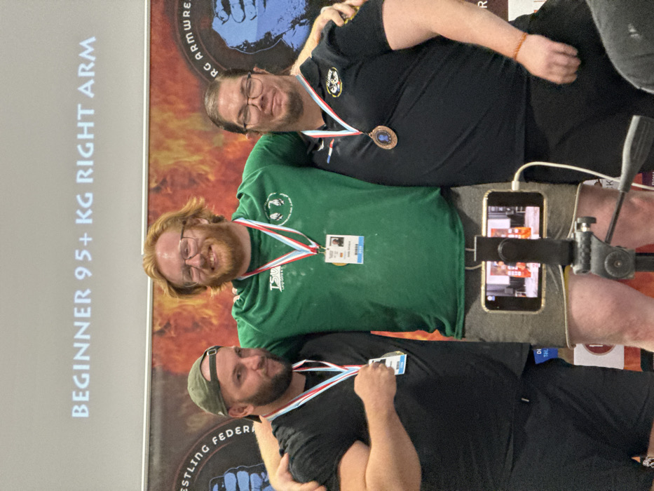 Three men pose in front of a sign that reads "BEGINNER 95+ KG RIGHT ARM