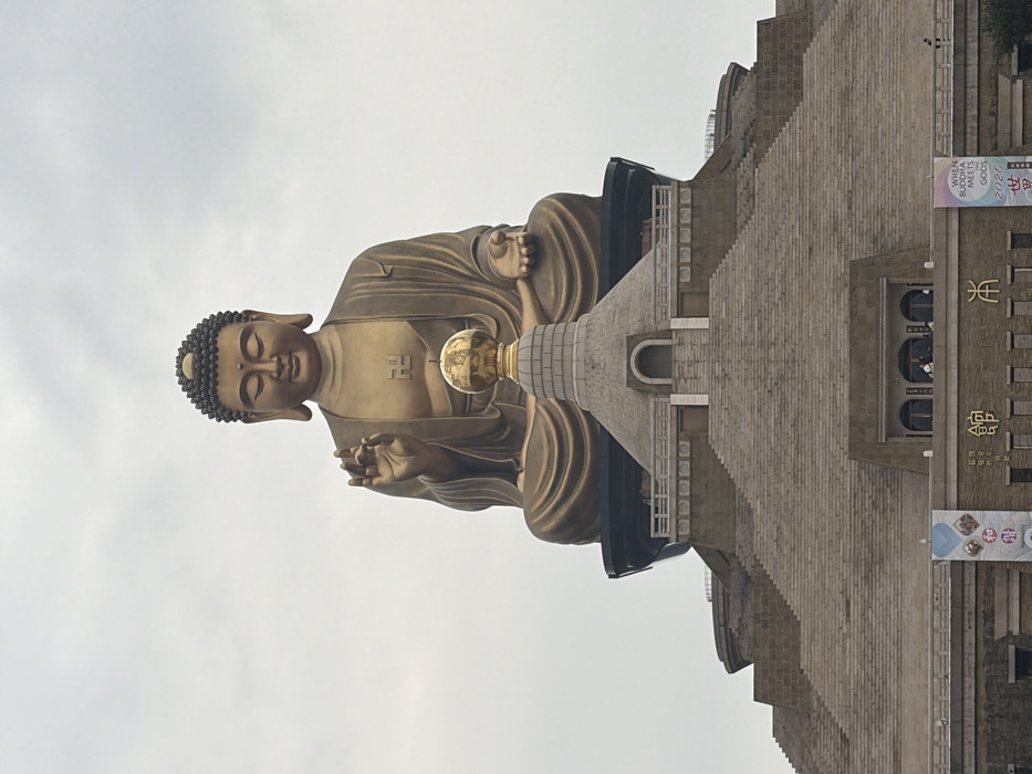 A large bronze Buddha statue dominates the frame against a cloudy sky