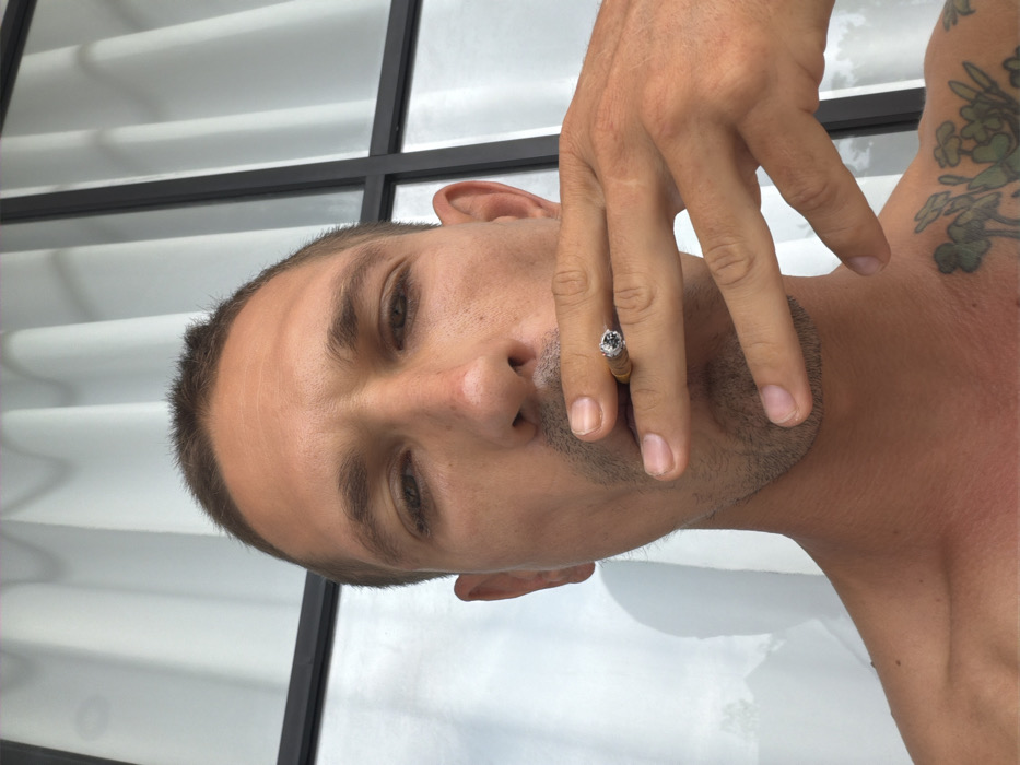 A man with short hair holds a lit cigarette near his mouth. He has light skin and stubble around his jawline. Part of a tattoo is visible on his shoulder. The background includes a set of horizontal, white blinds with a black frame. The man's face is angled toward the camera, creating a direct gaze.