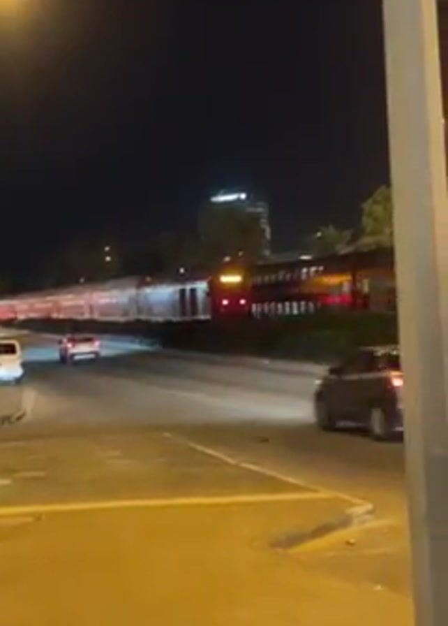 street scene at night, with multiple cars driving by. A building with a lighted logo on top is visible in the background, along with trees and a red structure behind them. The road markings are visible, and a light pole is on the right side of the frame. The lighting is generally dim, with streetlights illuminating the scene.