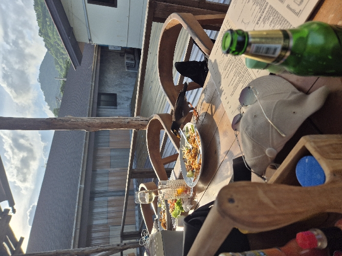 This image depicts an outdoor dining area in Baan Chaweng Noi, Thailand. A wooden table occupies the foreground and midground, furnished with two wooden chairs, one partially obscured and the other hosting a dark garment or bag. On the table, a white plate contains a partially consumed meal resembling fried noodles or rice, with a fork resting within. Adjacent items include a glass of white wine, a clear drinking glass, a small plate of green salad, and a green glass bottle, likely beer. A menu, partially unfolded, displays "COCKTAILS." A beige baseball cap with a pair of sunglasses draped over it, a wooden condiment caddy containing a blue cap, and a small red-capped bottle are also present. A dark-feathered bird, consistent with a myna, is perched on the backrest of a wooden chair, orienting its head towards the food. In the background, several buildings are visible; one features a dark shingled roof and a corrugated metal facade, while another exhibits a similar roof, a light-colored wall, and an external air conditioning unit. Beyond these structures, lush green mountains rise under a sky with scattered clouds, illuminated by late afternoon or early evening sunlight. No human subjects are visible.