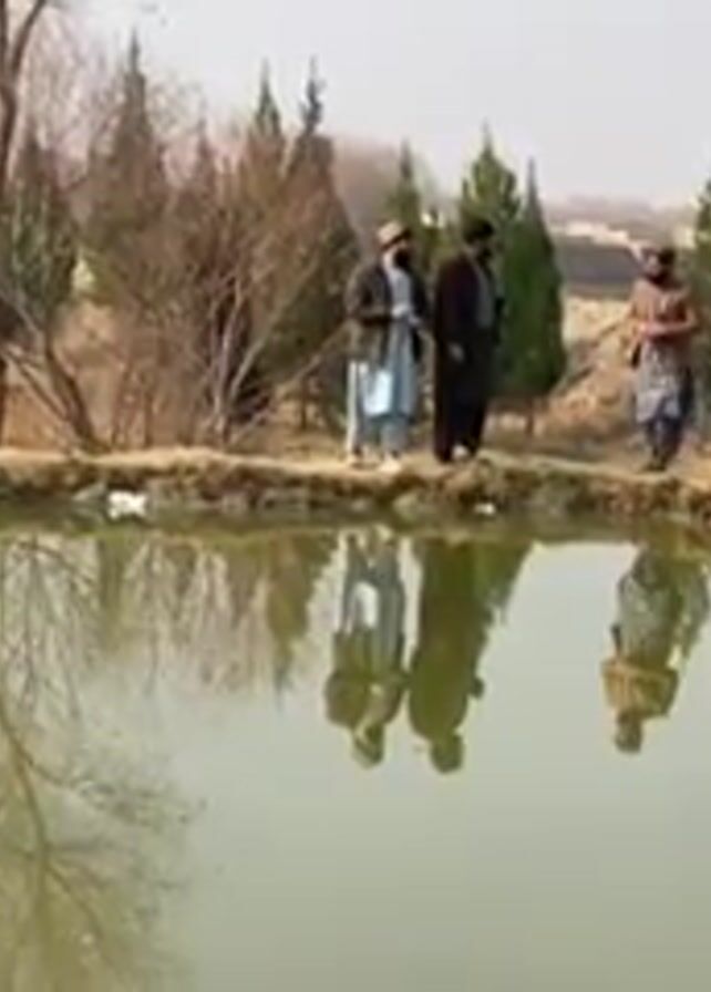 Four men stand along the bank of a small pond on a clear day. The men are wearing traditional clothing. Some have firearms. The pond reflects the men and the bare tree standing along the edge. There are evergreen trees in the background. The men are talking to each other, with one man holding a phone in his hand.