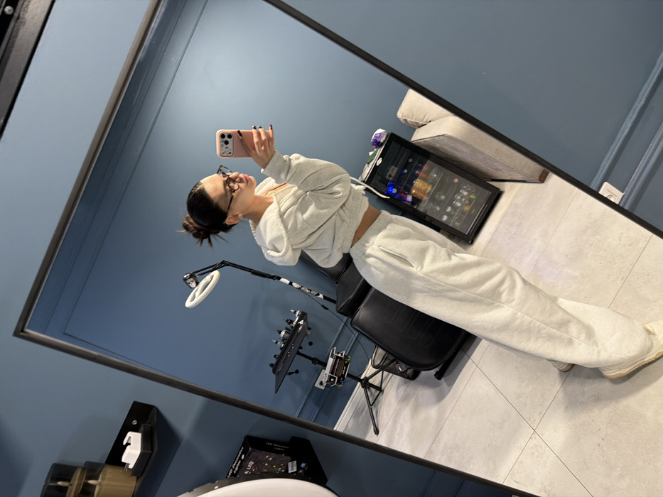 A female subject stands in profile on a light-tiled floor, capturing a mirror selfie within a professional establishment in Yerevan, Armenia. She wears a light grey two-piece tracksuit, comprising a cropped zippered hoodie and wide-leg sweatpants, along with light-colored sneakers. Her hair is styled in a bun, and she wears tortoiseshell-framed eyeglasses. She holds a pink-cased smartphone with dark painted nails to take the photograph. The background, reflected in the mirror, features dark teal walls. Visible objects include a black adjustable professional chair, a black utility cart holding multiple small containers on a tripod stand, a ring light on an adjustable stand, and a small black glass-front refrigerator stocked with various beverages. A portion of a light grey sofa is visible next to the refrigerator, and a black wall shelf with gold-colored decorative items is present in the upper left. The setting indicates an environment consistent with a beauty salon, tattoo studio, or similar aesthetic service provider.