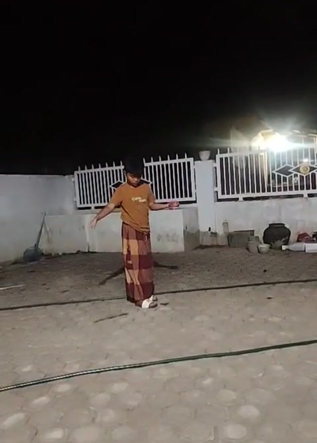 At night, a person wearing a brown shirt and a long, red-brown patterned sarong stands on a gray-paved surface, facing slightly right. They are holding an object, possibly a small ball or a cloth, in their left hand. With their right hand, they fling a small, light-colored object, likely a stick, into the air. The stick lands on the ground near their feet. The person then walks toward the left side of the frame. Behind the person, there is a white fence with decorative elements, set against a dark background. A light source, likely a house light, is visible behind the fence. A tree is present near the fence. The camera view then shifts to the left, following the trajectory of the stick. The person moves out of view. The tree and fence are now more prominently in the foreground. A green garden hose lies on the paved ground. A collection of items, including what appears to be a bag or blanket, is placed near the fence. The scene remains dark overall.