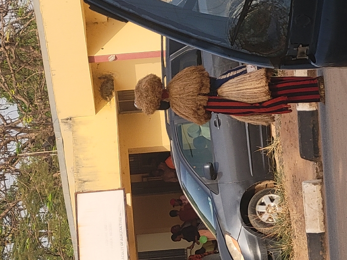 A daytime scene depicts an individual in a traditional masquerade costume standing on the paved shoulder of a road. The costume consists of a large, shaggy, light-brown fiber headpiece, a similar skirt-like garment around the waist, and a red and black vertically striped tunic and trousers. The figure is positioned to the right of a dark grey minivan that is parked on a dirt and grass verge behind a black and white curb. The minivan's front passenger side shows visible damage. In the background, a single-story, light-yellow building is visible, bearing a white rectangular signboard on its facade. The signboard text partially reads "UNIVERSITY OF... ONDO, NIGERIA" and "FACULTY OF AGRICULTURE." Through an open doorway of the building, several indistinct individuals are visible. Above the building, sparse tree foliage is present. A dark-colored vehicle's windshield and A-pillar are partially visible on the far right foreground, suggesting the viewpoint of the photographer. The scene takes place in Ondo, Nigeria.