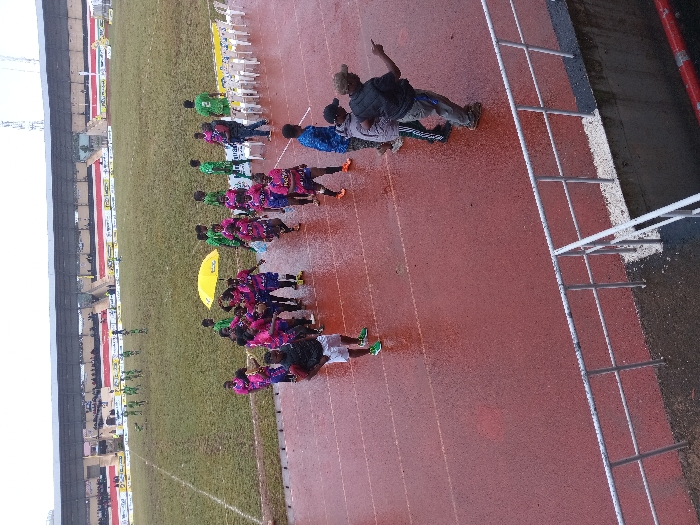 This image captures an outdoor sports stadium scene at Kinoru Stadium in Meru, Kenya, under overcast and wet weather conditions
