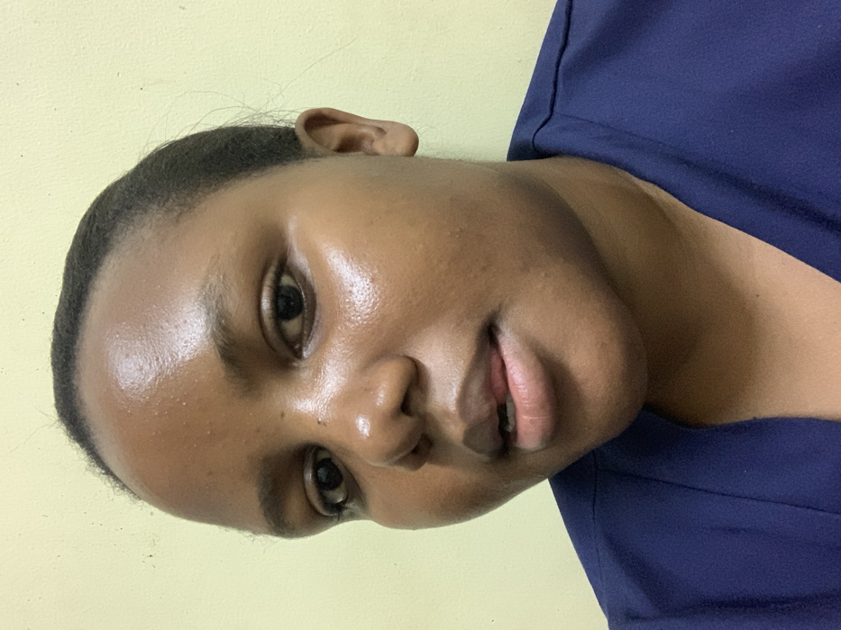 A close-up, head-and-shoulders portrait of an individual with dark skin, identified as being located in Dar es-Salaam, Tanzania. The subject, an adult female, directly faces the camera with a slight upward angle, her dark hair pulled back. Her skin exhibits a visible sheen on the forehead, nose bridge, and cheekbones, with minor textural irregularities present on the forehead and cheeks. Her dark eyes are open, maintaining direct eye contact. Her lips are slightly parted, revealing the upper front teeth and the tip of her tongue between them. She is wearing a dark blue garment with a V-neckline, possibly a uniform or scrub top. The background is a plain, light beige or pale yellow wall. No other individuals or distinct objects are visible. The lighting is even, illuminating the subject's face.