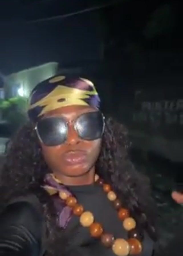 At night, a woman with dark skin, wearing a dark shirt, a purple and gold headscarf, large sunglasses, and a multi-toned wooden bead necklace, is recording a video of herself. She has curly hair, and the background is dark with buildings and greenery. The woman is looking at the camera and moving her hands as she talks. Traffic noises are audible.