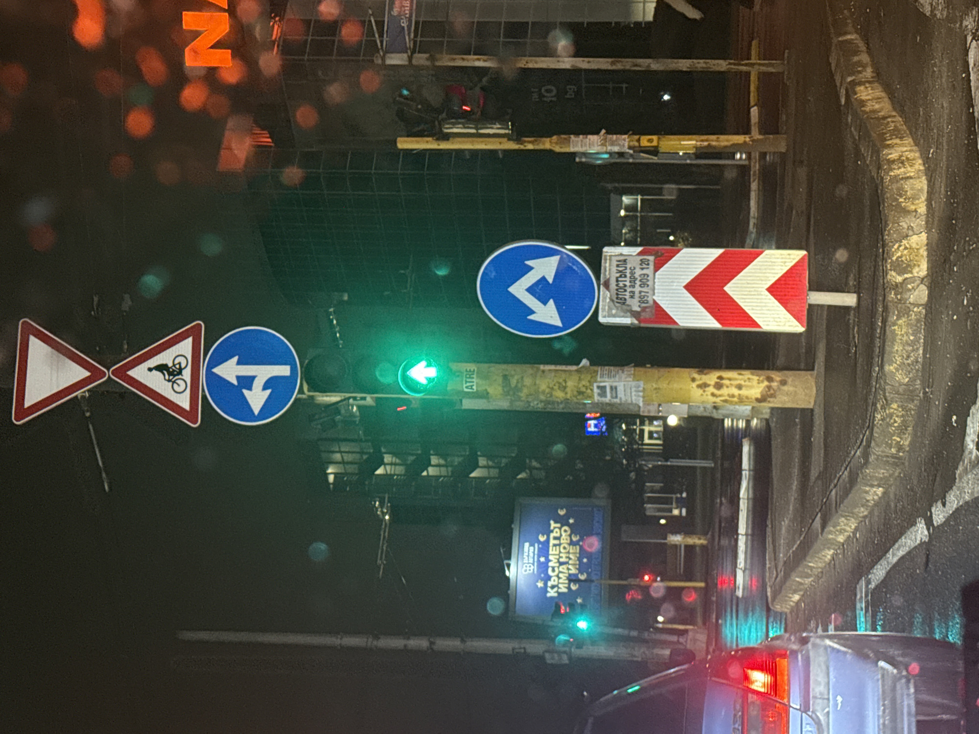 The image depicts a street scene at night in Sofia, Bulgaria. The view is from inside a vehicle, looking out through a wet windshield with prominent water droplets. A series of traffic signs are visible, including a triangular warning sign with a bicycle symbol, a blue circular sign indicating a left turn, and another circular sign indicating both left and right turns. A traffic light is green, pointing left. A red and white chevron sign points towards the right. An advertising poster advertises the word "КЪСМЕТЪТ" which is Bulgarian for "Luck". A phone number is also visible on one of the signs: 897 909 120. Car headlights and taillights are also visible.