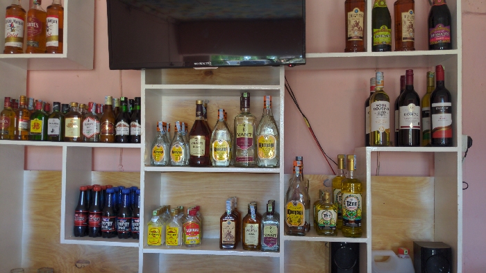 The image depicts an indoor scene featuring a comprehensive beverage display. White wooden shelving units, some with natural plywood backing, are mounted against a light pink-painted wall. A black flat-screen television is centrally positioned above the main shelving structure. The shelves are densely populated with various bottled beverages. The top left shelf contains three bottles of golden-colored spirits. The top right shelf displays four bottles, including a green-labeled bottle and a dark red bottle marked "IMPERIAL." The upper middle left shelf holds numerous spirit bottles of assorted shapes and sizes, with visible labels such as "JB," "GILBEY'S," and "SERVAY'S." The upper middle central shelves feature several clear and amber spirit bottles, identifiable brands including "K-VANT" and "Komarof," alongside smaller versions. The upper middle right shelf showcases four wine bottles, specifically one white wine labeled "FOUR COURSINS" and three red wines, one branded "BONNI." The lower left shelves are filled with multiple small spirit bottles. The lower central shelf contains numerous small plastic bottles with red and blue caps, some partially labeled "ENERGY." The lower right shelves display clear and amber spirit bottles, including "TZEE" and "Komarof" brands, along with smaller bottles. A black power cable descends from behind the television. Two black electronic speakers flank a white plastic jerry can on the bottom shelf level. No individuals are present in the scene. This scene is situated in the city of Soweto, Tanzania.