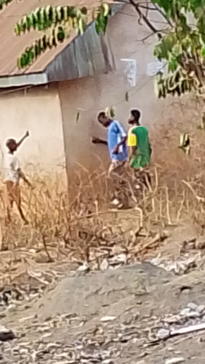 Three children stand outside of a building in an area with dry vegetation. The boy on the left has his arm raised in the air. The other two boys are dressed in colorful shirts; one in blue and the other in green and yellow. The building has a metal roof. The background is slightly blurry, but trees are visible behind the building. The overall scene is a candid moment capturing the children in their environment.