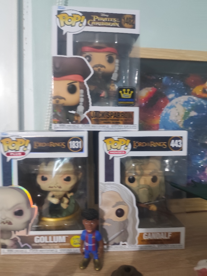 This image captures a static display of collectible figures within a residential or display setting in Dimitrovgrad, Bulgaria. The central focus is on three Funko Pop! vinyl figures in their original packaging, arranged on a light brown wooden surface. At the top, a Funko Pop! "Jack Sparrow" figure (No. 1402) from "Pirates of the Caribbean" is visible in its white box. The figure inside wears a red bandana and has a goatee. A gold crown "Funko Special Edition" sticker is affixed to the clear plastic window of its box. Below the Jack Sparrow figure, two additional Funko Pop! figures from "Lord of the Rings" are displayed. On the left, a "Gollum" figure (No. 1831) is in its white and blue striped box. The figure inside is pale, with large eyes, holding a fish. To its immediate right, a "Gandalf" figure (No. 443) from "Lord of the Rings" is in a similar white and blue striped box. The figure inside features a long white beard and gray attire. In front of the "Gollum" box, a partially visible, unboxed pale-skinned Funko Pop! head and upper torso with large eyes is present. Directly in front of the "Gollum" and "Gandalf" boxes stands a small, dark-skinned male figurine with black hair, wearing a blue and red striped athletic shirt and gold-colored shoes, consistent with a football player. The wooden surface extends across the lower portion of the image. A light blue wall serves as the background, with a white vertical architectural feature (possibly a door frame or wall corner) on the far left. To the right of the Jack Sparrow box, a framed object containing a textured, spherical artwork resembling a planet or galaxy, predominantly blue and red, is partially visible. A small, dark, amorphous object rests on the wooden surface in the lower center-right, and a small green object is partially visible on the far right edge of the frame. No individuals are present, and no actions or interactions are depicted.