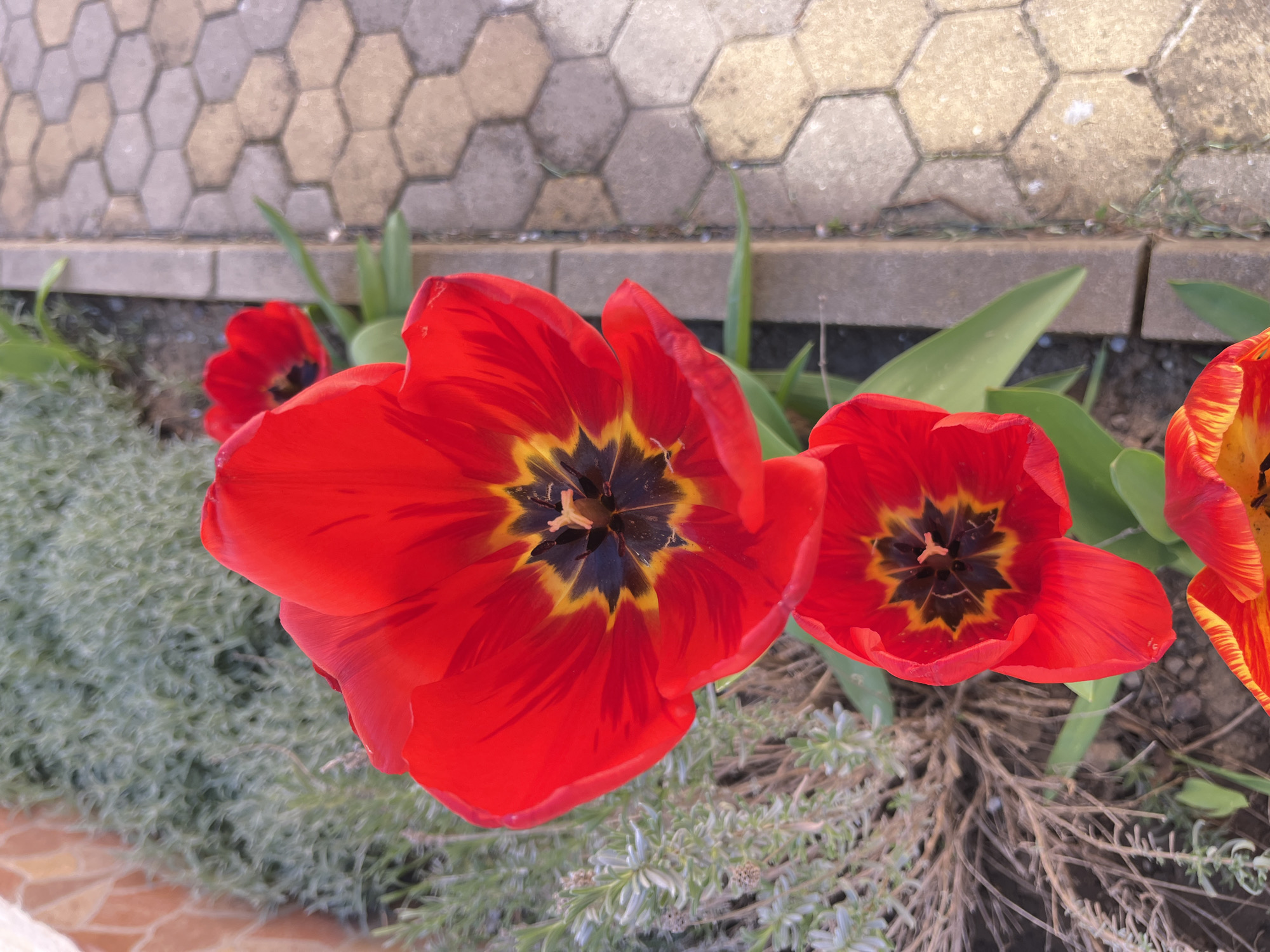 several red tulips in full bloom, viewed from above. The tulips have a dark center with yellow accents. They are growing in a garden bed with gray-green foliage. Behind the flowers is a paved walkway with hexagonal stones in gray and beige tones. Based on the query, the location is Kostinbrod, Bulgaria.
