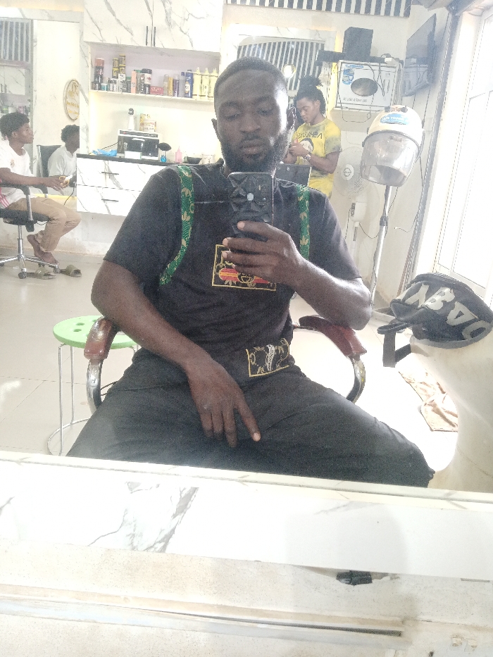 The image depicts the interior of a hair salon or barbershop located in Sabon Tasha, Nigeria. In the foreground, a dark-skinned male subject with a beard and short hair is seated in a barber chair with a light green backrest and wooden armrests. He is wearing a black t-shirt with a green patterned trim on the shoulders and a gold, red, and black emblem on the chest. He wears black trousers with a gold-patterned detail on the left hip. He holds a dark-colored smartphone with both hands, pointed towards himself, appearing to capture a selfie reflection in a large mirror, which serves as the primary perspective for the image. His right hand is resting on his left thigh, forming a "V" sign with his fingers. In the mid-ground, visible behind the main subject's reflection: To the left, another dark-skinned male is seated in a silver-framed swivel chair, wearing a white t-shirt and light brown trousers, facing away. His feet are bare, with sandals on the floor nearby. To the right, a dark-skinned male with dreadlocks, wearing a yellow t-shirt, stands facing towards the left, appearing to be working or attending to something. A wall-mounted shelving unit containing various hair care products in bottles and containers is visible on the wall. Below the shelves is a white countertop. Essential salon equipment includes a standing fan and a white hooded hair dryer on a stand. A black cap with white lettering, possibly "DABY", rests on a white surface, possibly a washbasin. The background features light-colored tiled flooring and walls with a white and dark grey marble-like pattern.