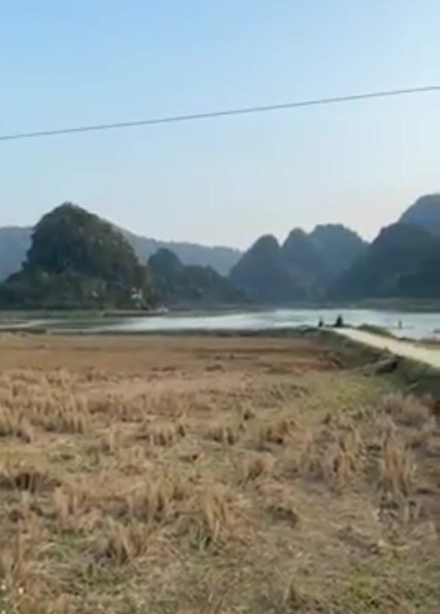 rural scene with a body of water, possibly a lake or wide river, surrounded by mountains. In the foreground, there's a dry, harvested field with scattered straw. A dirt path runs alongside the water, and a person wearing a red shirt is walking on the path. The camera follows their movement as it pans to the right, revealing more of the water and the mountainous landscape in the background. There are electrical poles and wires visible overhead. The sky is clear and blue. The scene is peaceful and appears to be in a countryside setting.
