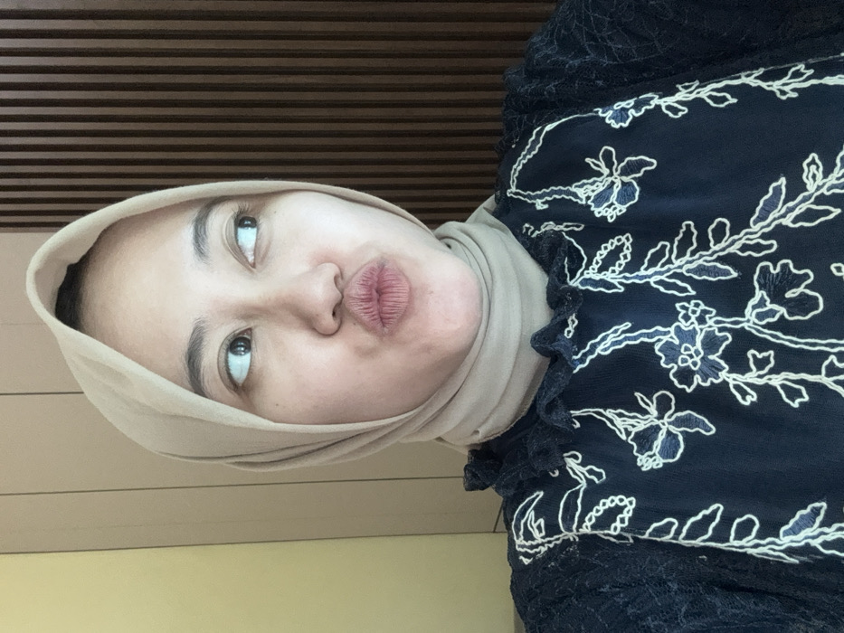 - "A woman wearing a tan hijab and a dark blue top with white floral embroidery puckers her lips, looking upwards with a slightly tilted head" by FM-2HdLF2, licensed under CC BY 4.0