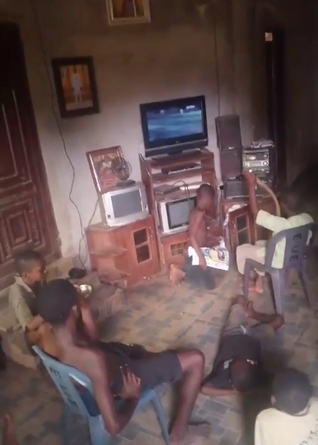 A room is seen with tiled floors and pale walls, containing several young people of varying ages, most likely children. Some are seated on chairs, while others are on the floor. A television is playing, and there is an older-style entertainment center holding smaller TVs and audio equipment. Two framed pictures are hanging on the wall, and there are other items scattered around the room, including what appears to be a case of drinks.