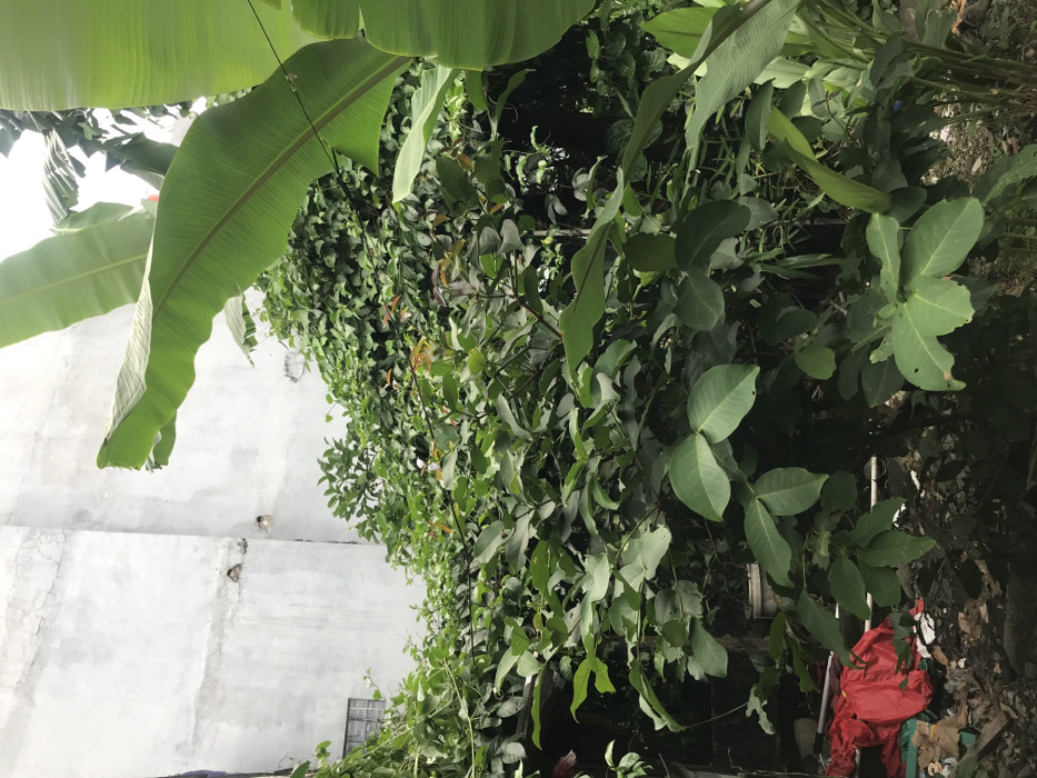 The image displays an overgrown outdoor area adjacent to a building in Bogor, Indonesia