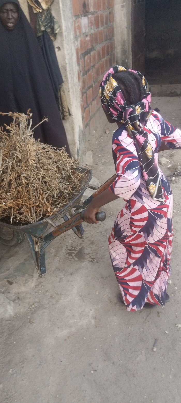 An outdoor scene in Minna, Nigeria, depicts two individuals and a wheelbarrow filled with dried plant material