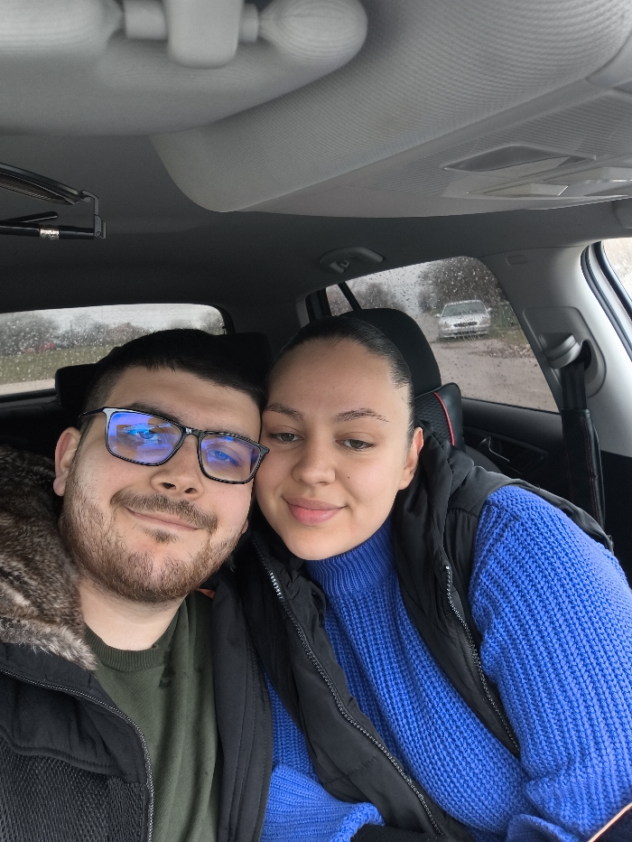 An interior shot depicts two young adults, a male and a female, seated in the front passenger area of a vehicle in Avren, Bulgaria