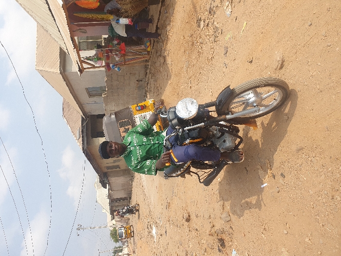 The image captures an unpaved dirt road, identified as being in the city of Burwood, Australia, under a bright sky with scattered clouds. In the foreground and midground, a male individual of apparent African descent is seated centrally on a black motorcycle, facing the camera. He wears a green short-sleeved shirt with white patterns, dark blue trousers, and dark open-toed sandals, topped with a black baseball cap worn backwards. The motorcycle is black, equipped with a clear circular headlight, silver wheel rims, and a visible engine block. To the left, further down the dirt road, a yellow three-wheeled auto-rickshaw is observed moving away from the camera. Behind it, another person is seen on a second motorcycle, also moving in the distance. Overhead, multiple utility wires crisscross the sky. Buildings with light-colored walls and corrugated iron roofs line both sides of the road. On the right side of the frame, a makeshift outdoor stall or shop is present, featuring a corrugated iron roof canopy. Various items, including brooms and buckets, are displayed for sale. A second individual is partially visible behind this stall, engaged with the merchandise. The environment suggests an active area with unpaved surfaces and specific architectural characteristics.