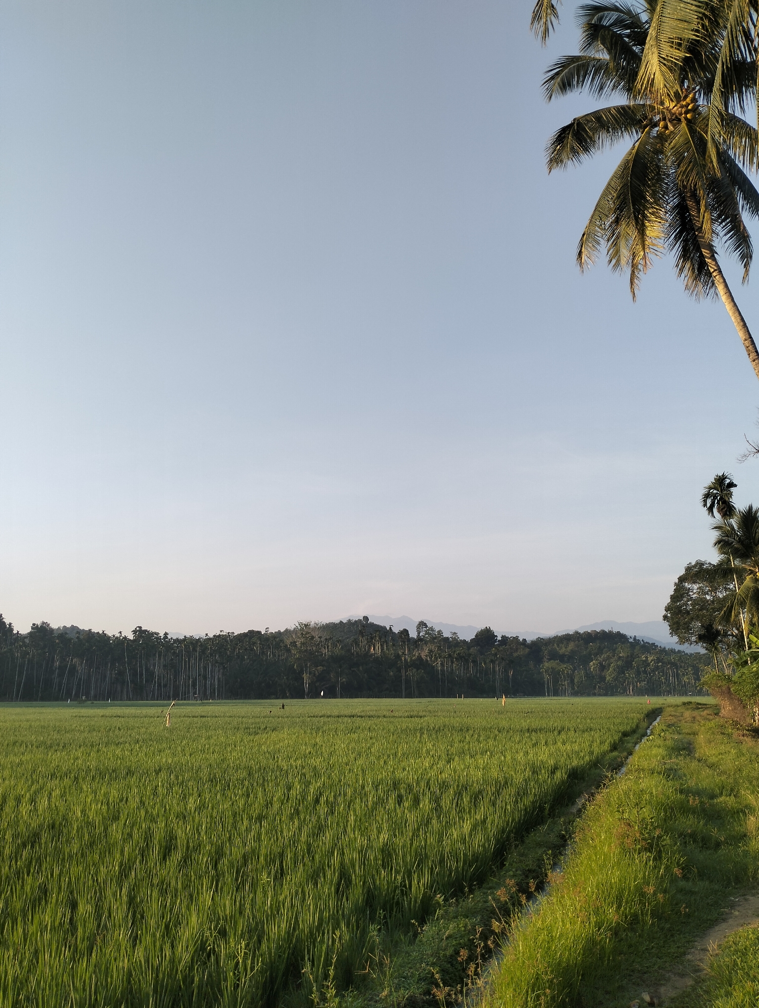 The image displays an expansive agricultural landscape located in Meunasahalue, Indonesia. The upper third of the frame shows a clear, light blue sky. The foreground and mid-ground consist of a large, uniformly green field, indicative of rice cultivation, with dense, upright crops. A narrow, unpaved dirt path, bordered by a grass-lined irrigation ditch, runs diagonally along the right edge of the field towards the lower right corner. The path and ditch are illuminated by direct sunlight, casting subtle shadows. In the upper right corner, a significant portion of a coconut palm tree is visible, featuring green fronds and several coconuts. Additional dense foliage and palm trees are present along the right side of the frame. The far edge of the green field is delimited by a dense line of tall, slender palm trees, consistent with Areca palms. Behind these trees, a forest landscape transitions into distant, hazy mountains. Several slender, light-colored stakes or poles are sparsely positioned throughout the green field. No discernible human figures, specific actions, or interactions are evident within the scene.