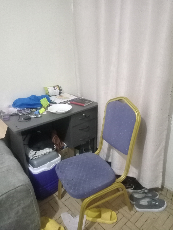 The image depicts an indoor scene in Nairobi, Kenya, focused on a section of a room. No individuals are present. To the left, a grey upholstered sofa is partially visible. Centered in the midground is a grey desk or dresser with three drawers on the right side and an open compartment on the left. The desk surface is cluttered with various items: a blue fabric object, several papers, a small packaged item (possibly food), a white plate with a design, a red book or folder, and smaller unidentified objects including a yellow marker and what appears to be a black electronic device. Inside the open compartment under the desk, a blue and white cooler box is visible, stacked with folded items, along with a brown cardboard box behind it. To the right of the desk is a chair with a gold-colored metal frame and blue patterned upholstery on the seat and backrest. Behind the chair, white curtains hang along the wall. On the floor to the right of the chair, a pair of grey slip-on shoes with white soles and a pair of black shoes are visible. Yellow slide sandals and a piece of white paper or fabric are present on the floor directly in front of and under the chair. The floor is covered with light-colored tiles arranged in a diagonal pattern. The walls are plain white.