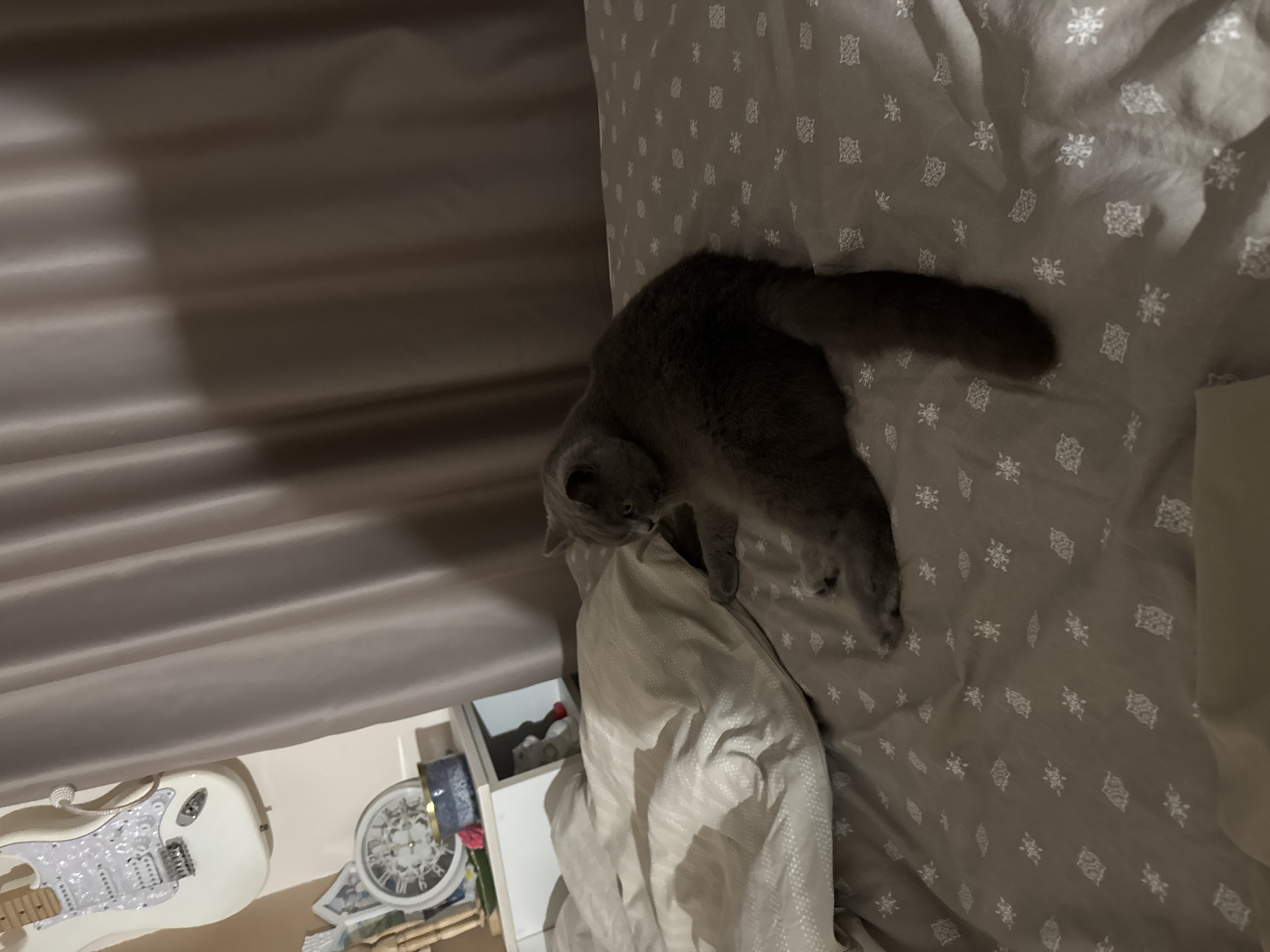 A grey cat is playing on a bed covered with a patterned grey duvet. To the left of the bed, partially visible, is a white electric guitar and a white bedside table. It is not possible to determine if the location is in the city of Primorsko, Bulgaria, from the information provided in the image.