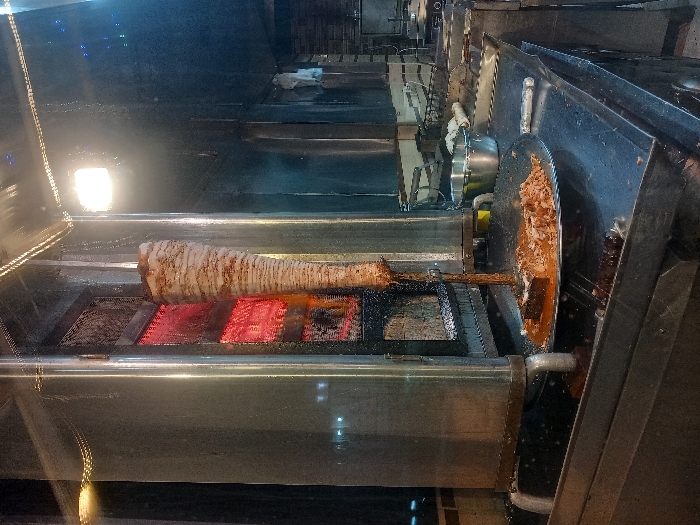 - "The image depicts a vertical shawarma spit rotating within a stainless steel commercial broiler, positioned in a food preparation area in Munin, Syria" by FM-f9Cwn2, licensed under CC BY 4.0
