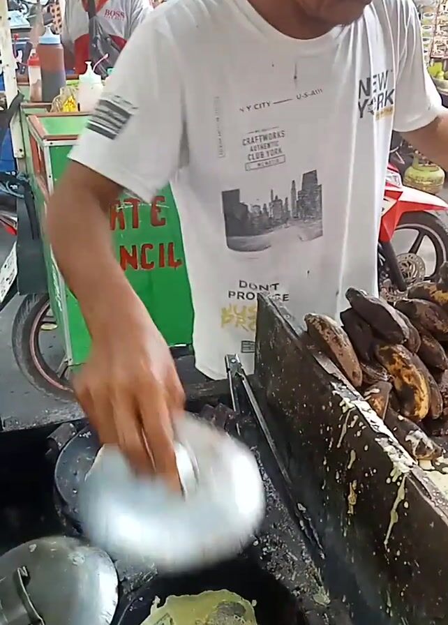 A man is cooking in an outdoor setting, likely a street food vendor. He wears a white t-shirt with a cityscape graphic and a baseball cap. His hands are visible as he uses a spatula to maneuver food in small, covered frying pans. Several cooked bananas are piled up to his left. He stands behind a green cart with writing on it. In the background, there are other people, motorcycles, and various objects typical of a busy street. The cooking surface appears to be oily and stained.