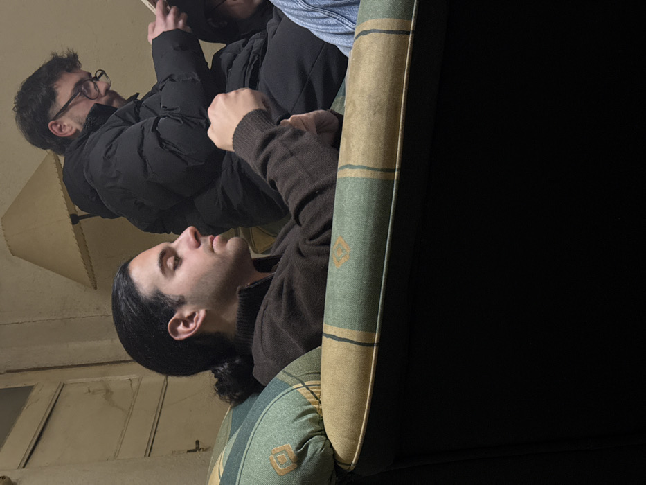 Three people lounge on a patterned couch. One man, wearing glasses and a black puffer jacket, sits upright. Another man in a brown sweater reclines, his head resting near the couch's armrest. A partial view of another person, wearing denim, is visible above them. The setting seems like a casual indoor space, possibly a living room, with a lamp in the background and a partially visible window on the left side.