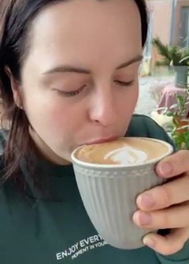 A woman with dark hair, wearing a green sweatshirt with the inscription "ENJOY EVERY MOMENT IN YOUR LIFE" is seen sipping from a gray ridged mug with latte art on top