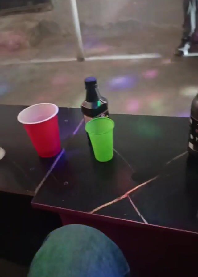The video opens with a view of a table in what appears to be a room with a party atmosphere. On the table are a red plastic cup, a green plastic cup, and two bottles, one dark with a gold cap and the other dark with a blue cap. Reflected light indicates a disco ball effect. The camera pans to the right, revealing additional tables and a group of about six men sitting cross-legged on the tables, facing each other and engaged in conversation. Some people are standing around the group as well. The room has a simple, somewhat unfinished look, with white walls and a basic ceiling. The atmosphere suggests a casual, social gathering.