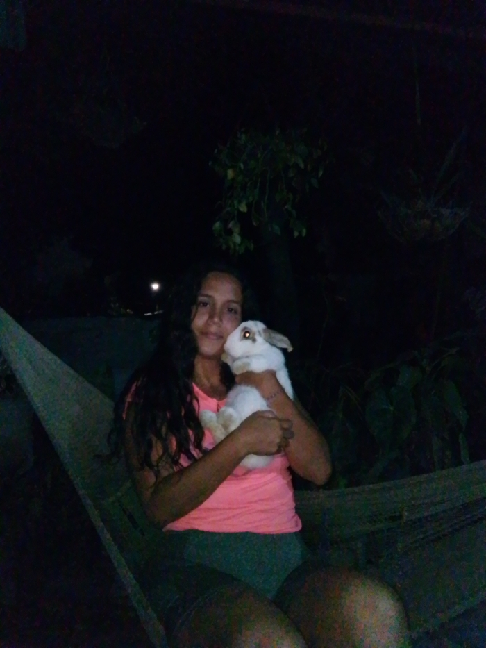 A nighttime photograph captures a young woman seated in a hammock, holding a rabbit, in an outdoor setting in Juan Griego, Venezuela