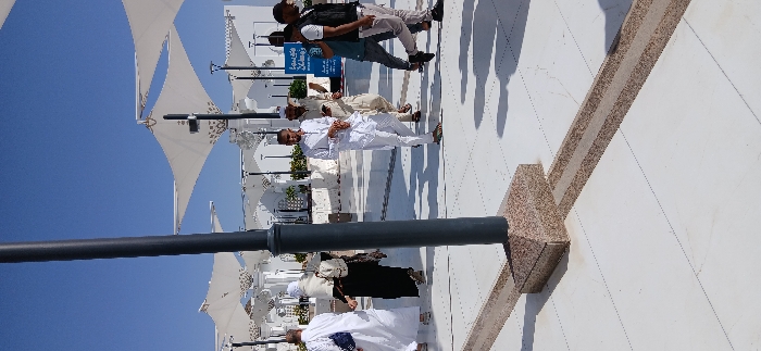 The image depicts an outdoor scene in the courtyard of Al-Masjid an-Nabawi (The Prophet's Mosque) in Medina, Saudi Arabia