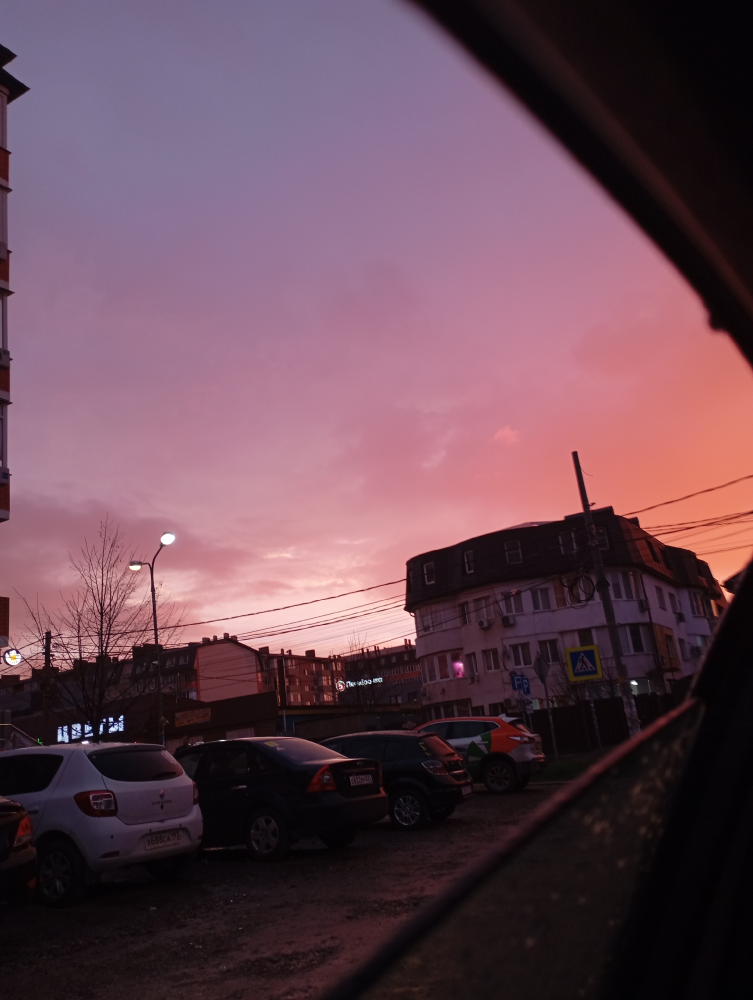 The photograph is taken from inside a vehicle, looking out onto a street in what appears to be Krasnodar, Russia. The sky is awash in shades of pink and orange, suggesting either sunrise or sunset. Several buildings line the street, one a multi-story with visible windows and air conditioning units, and another a sign is visible with Russian lettering. A street lamp is also visible, along with various wires running across the sky. A parking lot is in the foreground with several parked cars. The license plate of one white car and one black car is partially visible. A pedestrian crossing sign is also present near the building. The overall light level is low, contributing to the darkening foreground.